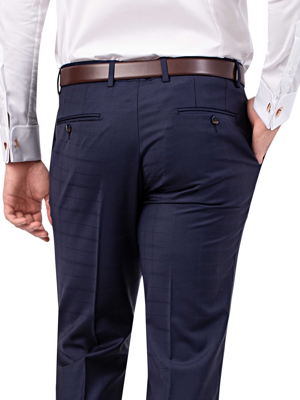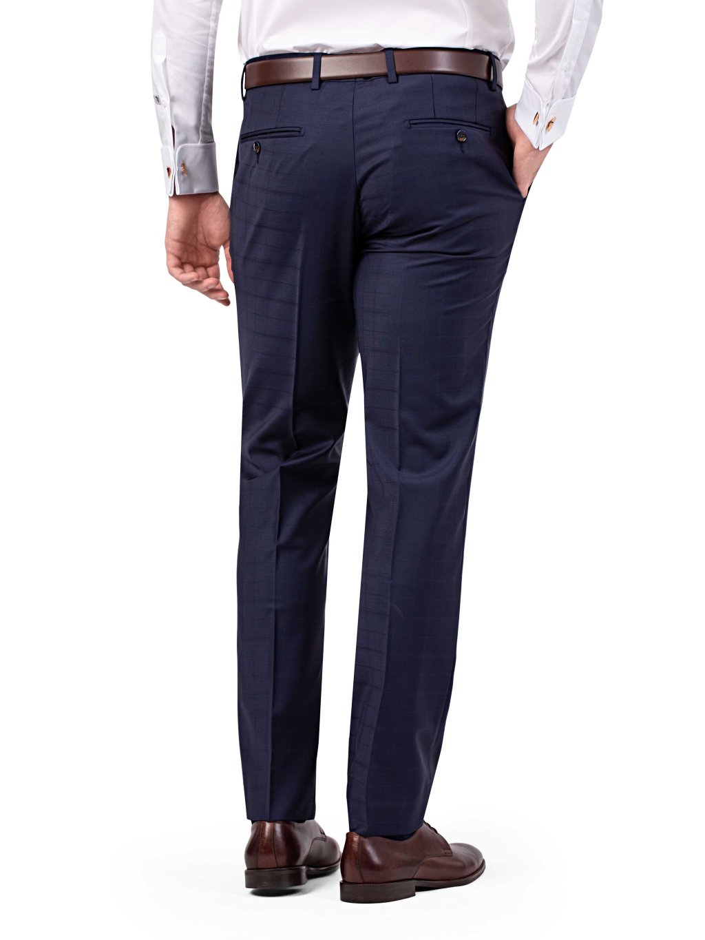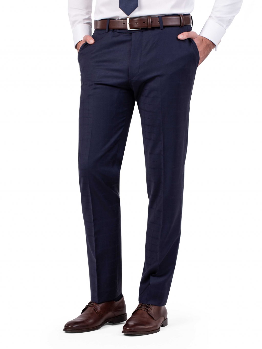 Pánské strečové oblekové kalhoty MONTANA ušité v modré barvě s jemným vzorem. Střih slim fit. Ideální oblek na svatbu.