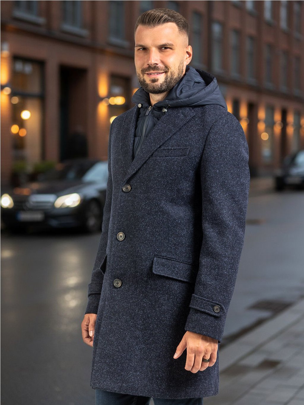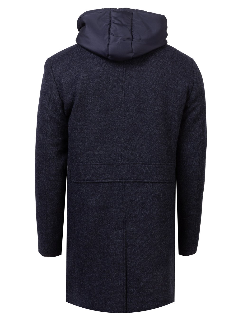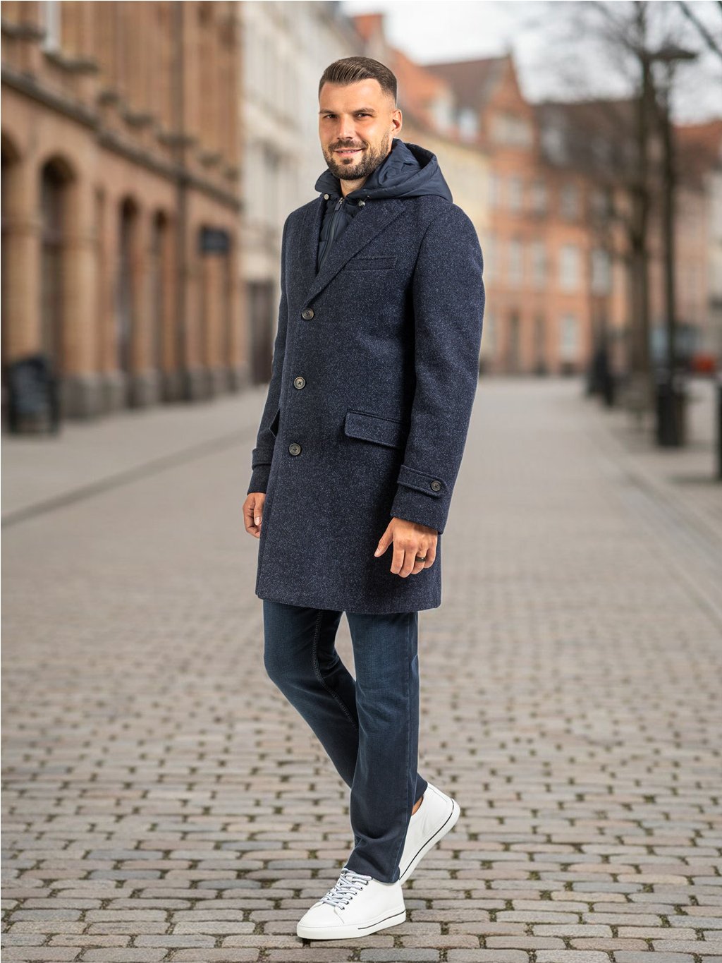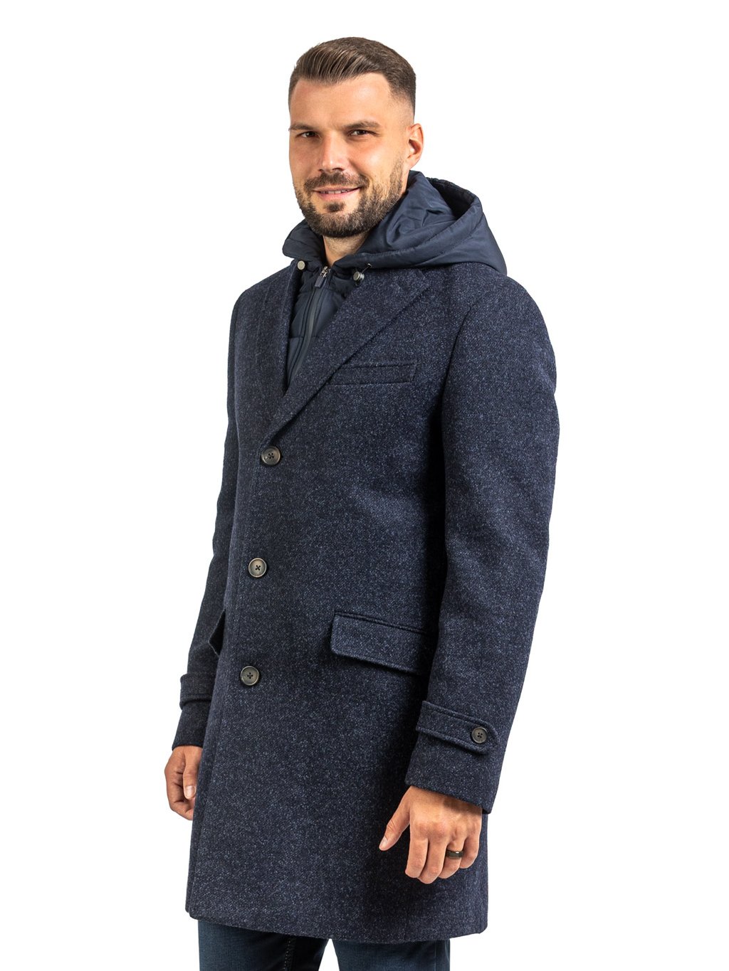 Pánský kabát MONTI ušitý v tmavě modré barvě s jemným vzorem a odnímatelnou vsadkou s kapucí. Vyrobený ze směsi vlny.