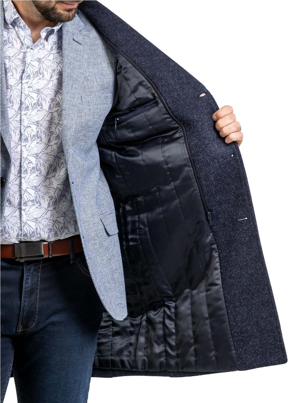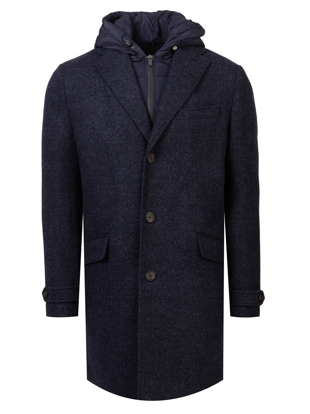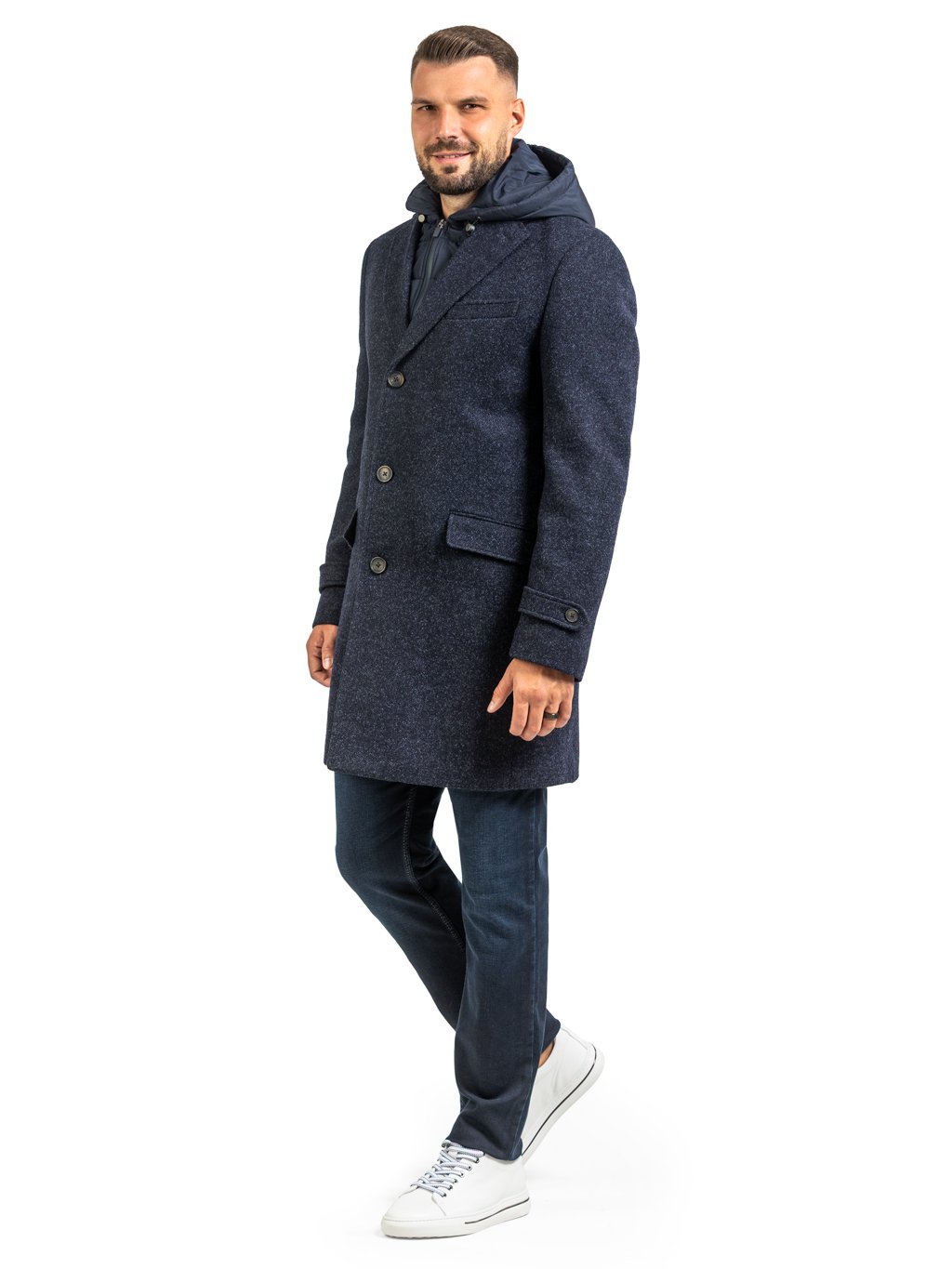 Pánský kabát MONTI ušitý v tmavě modré barvě s jemným vzorem a odnímatelnou vsadkou s kapucí. Vyrobený ze směsi vlny.