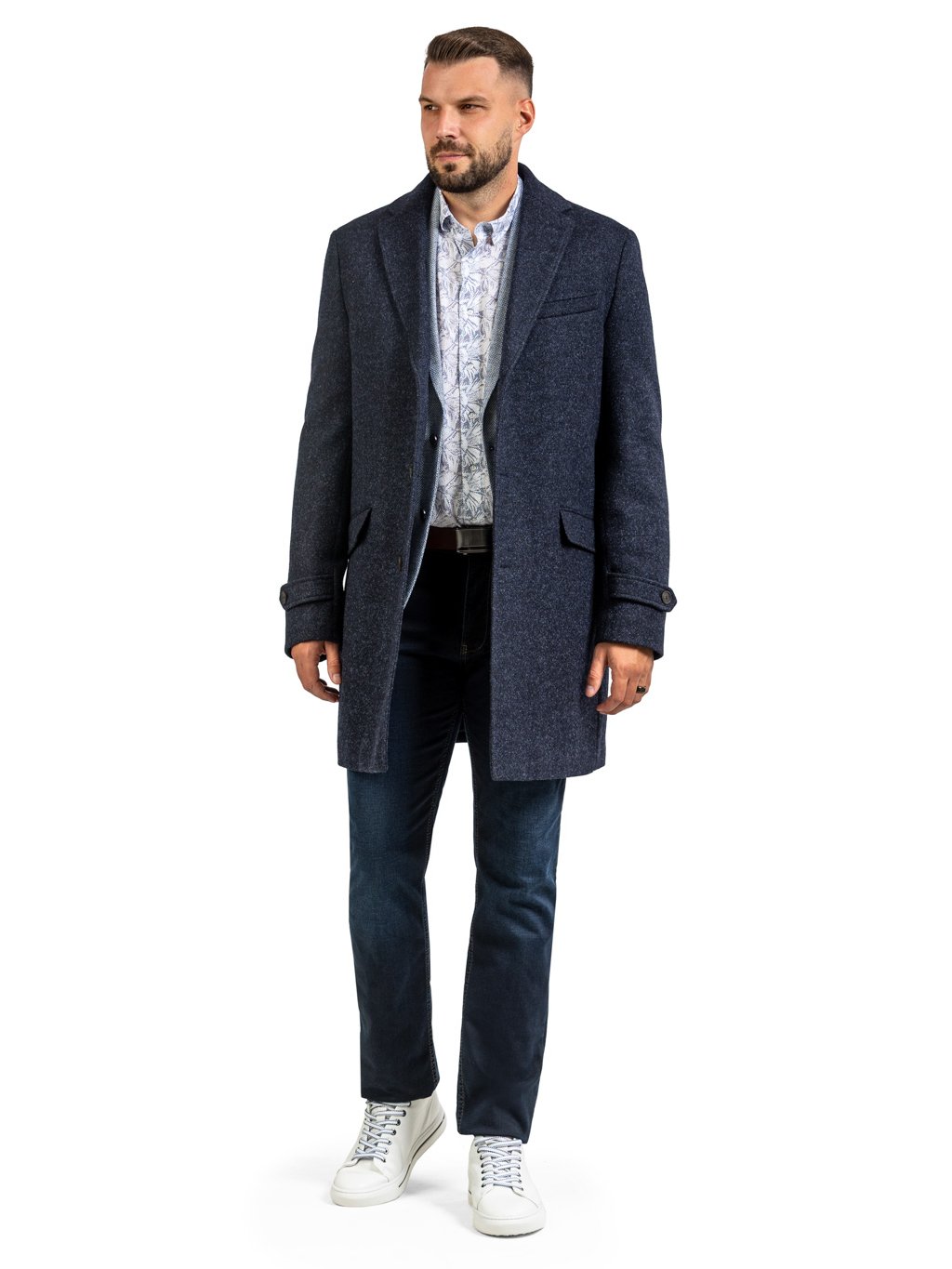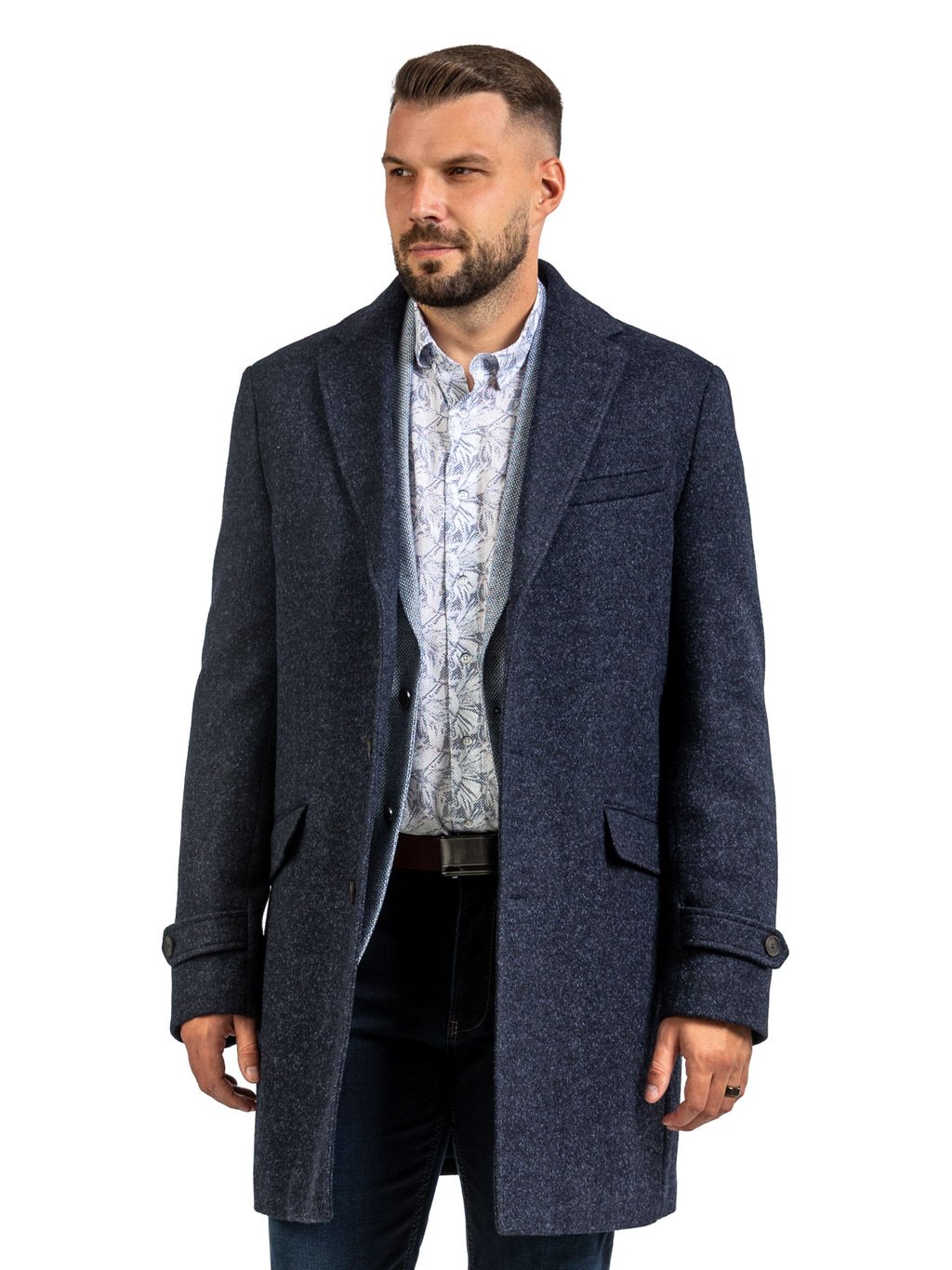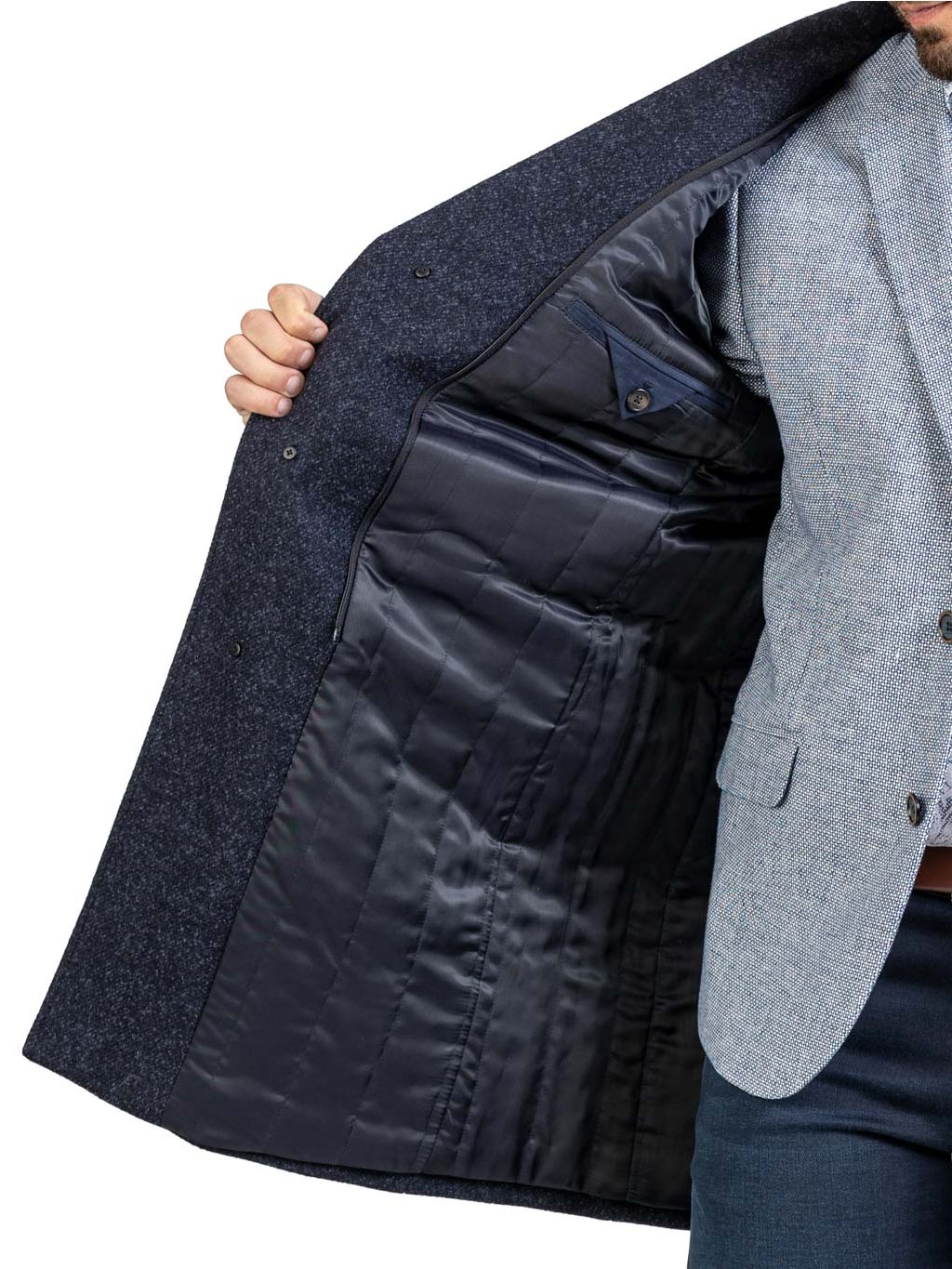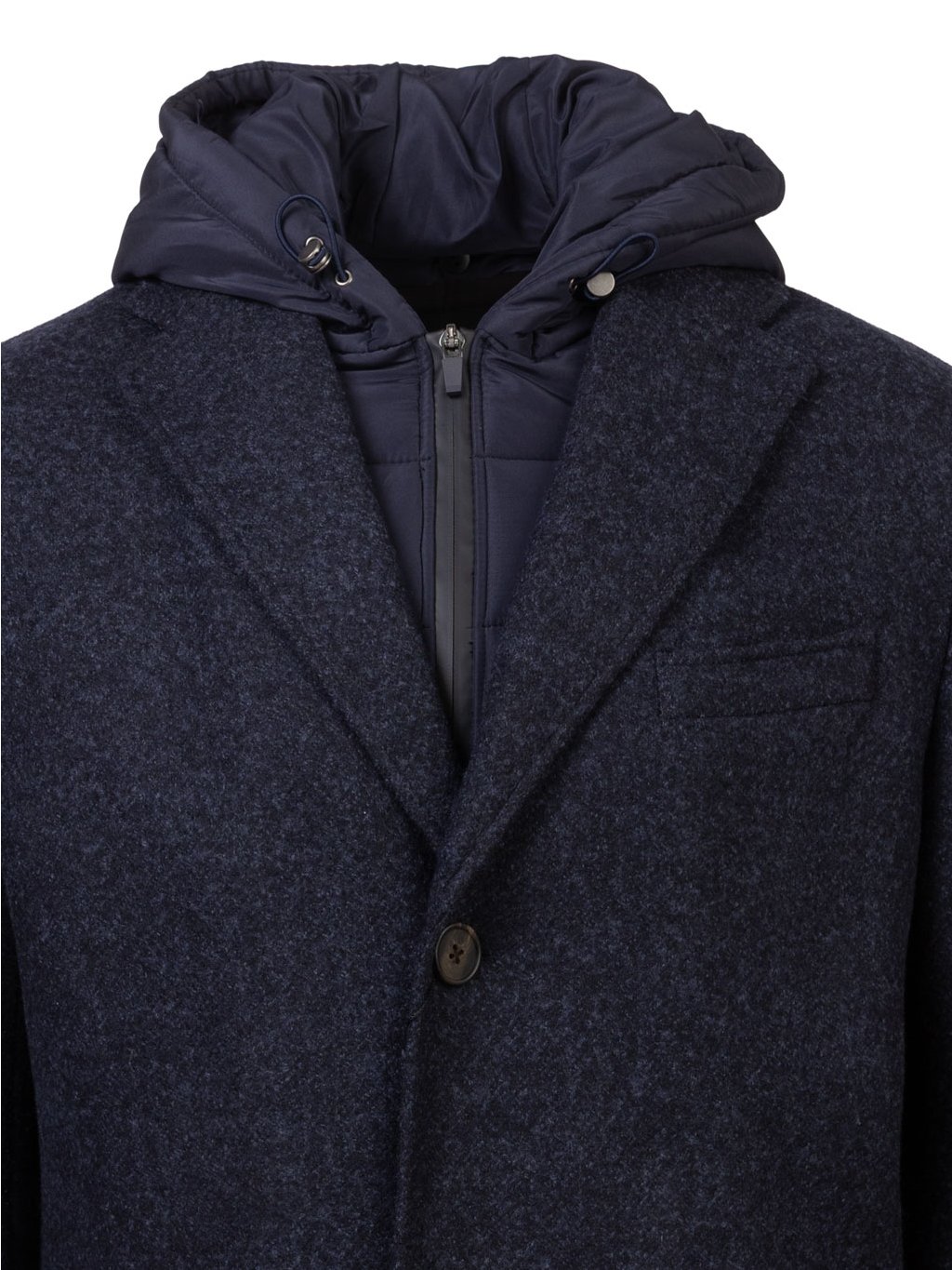Pánský kabát MONTI ušitý v tmavě modré barvě s jemným vzorem a odnímatelnou vsadkou s kapucí. Vyrobený ze směsi vlny.