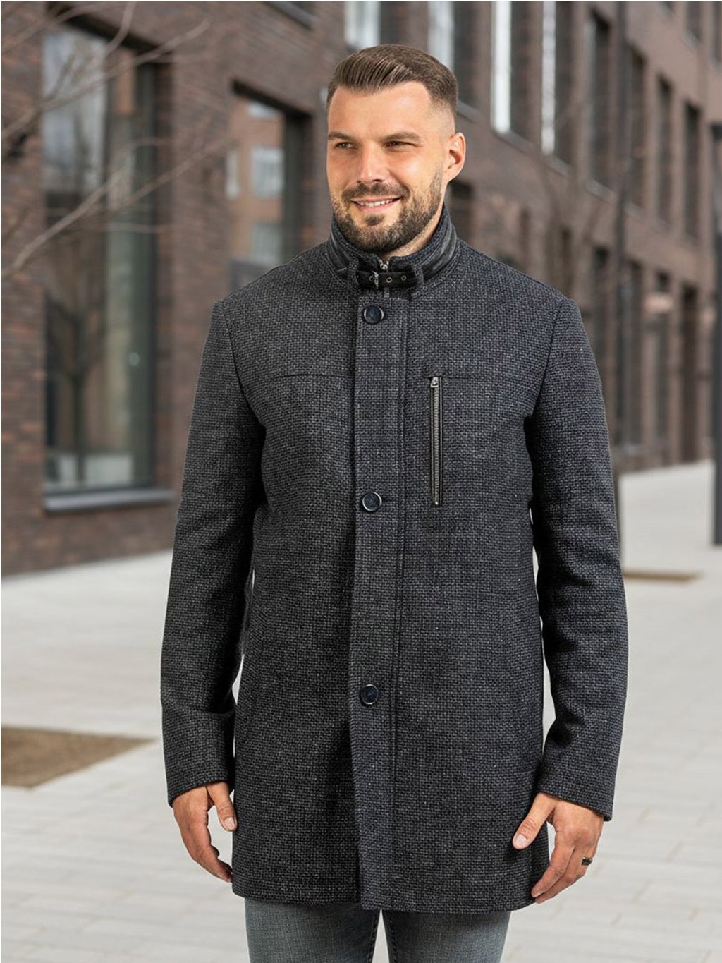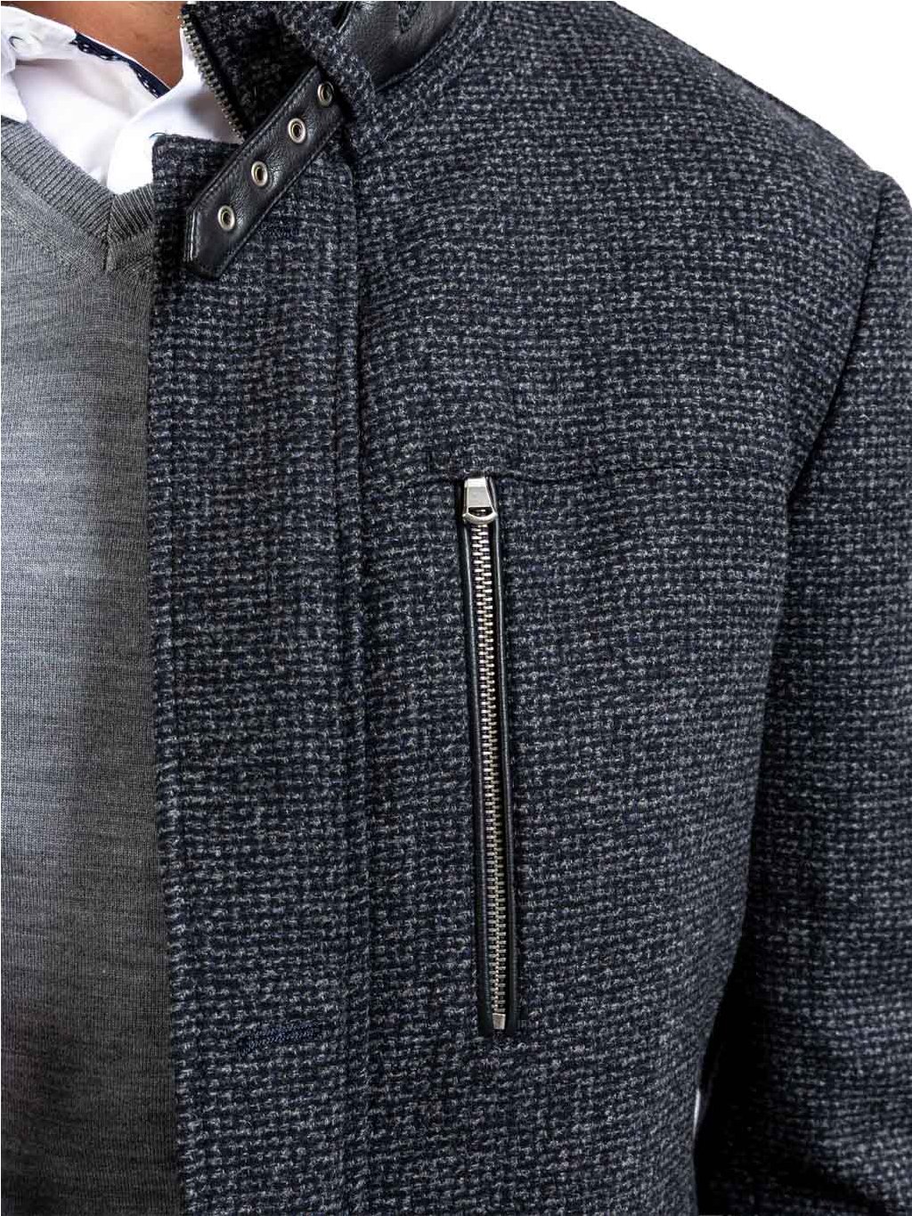 Pánský zimní kabát RAY v šedo-modré barvě s jemným vzorem. Materiál je velmi jemný a příjemný na dotek. Zimní kabát má několik designových detailů - ozdobné zapínání u krku, vnitřní límec z pleteniny a propracovaný střih.