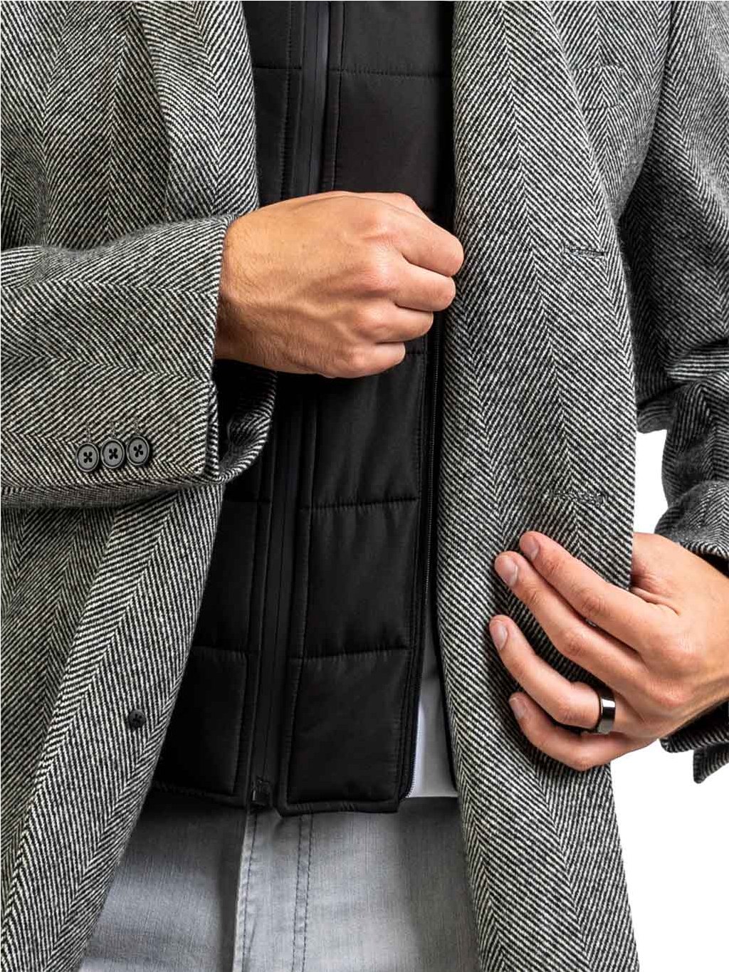 - Po jejím odejmutí získáte elegantní kabát na knoflíky vhodný k obleku.