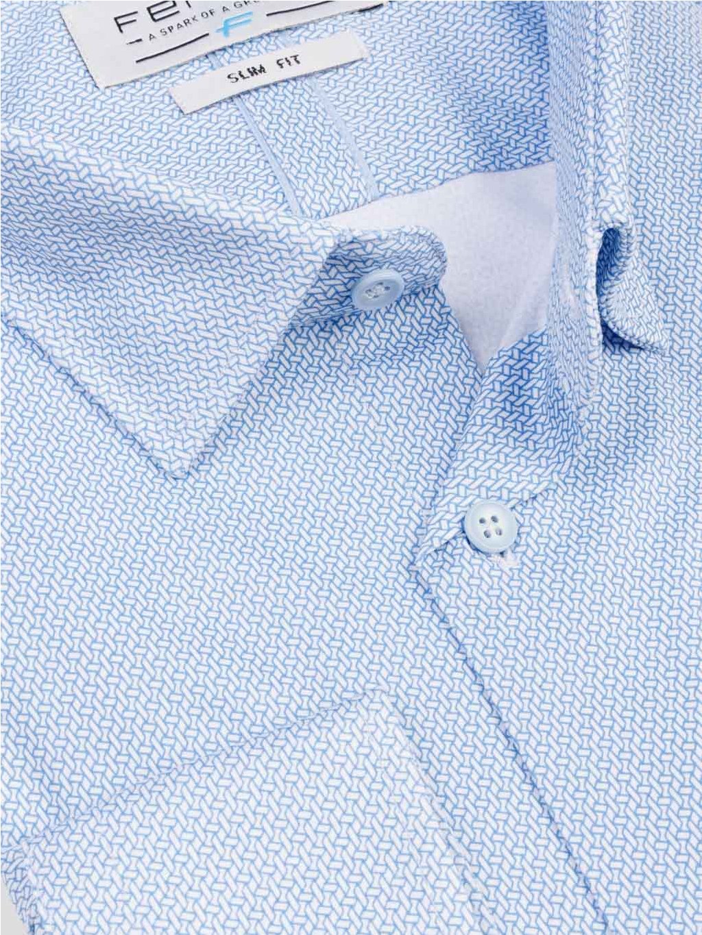 • Vzor: 3D vzor ve světle modré barvě na bílém podkladu dodává na zajímavosti. Košili snadno sladíte s ostatními částmi vašeho outfitu, jako jsou jednobarevné kalhoty, sakoboty nebo opasek.
