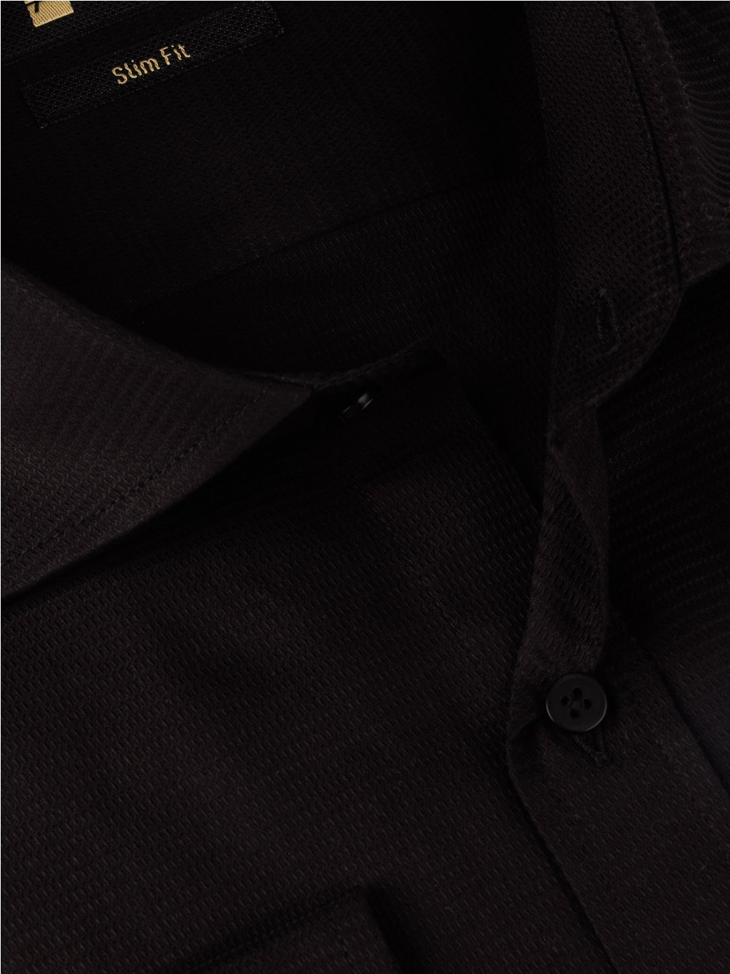Elegantní pánská košile LISABON v černé barvě s jemnou strukturou. Ideální volba pro všechny formální příležitosti. Perfektně doplní váš outfit na návštěvu divadla, oslavu narozenin nebo pracovní jednání.