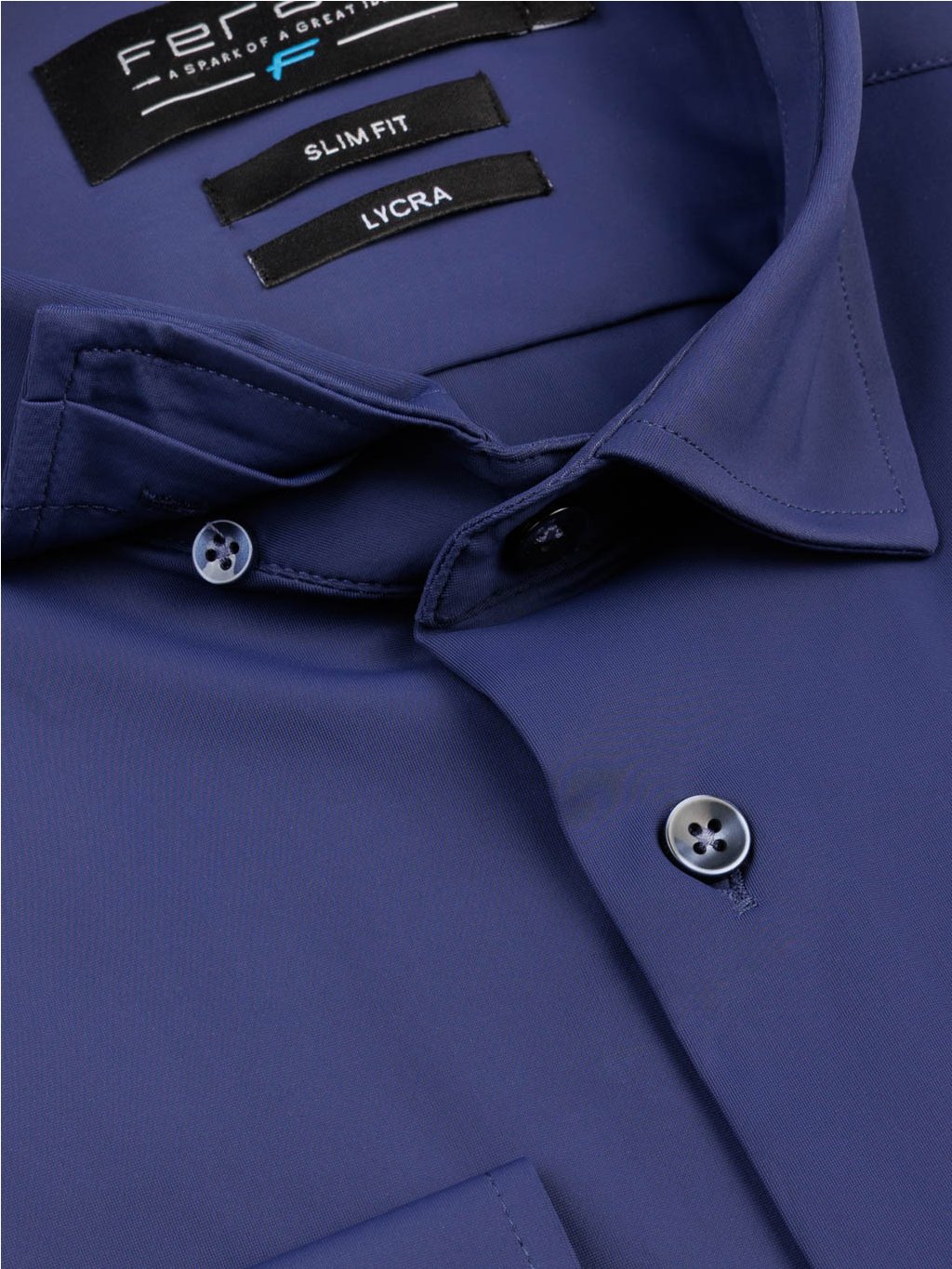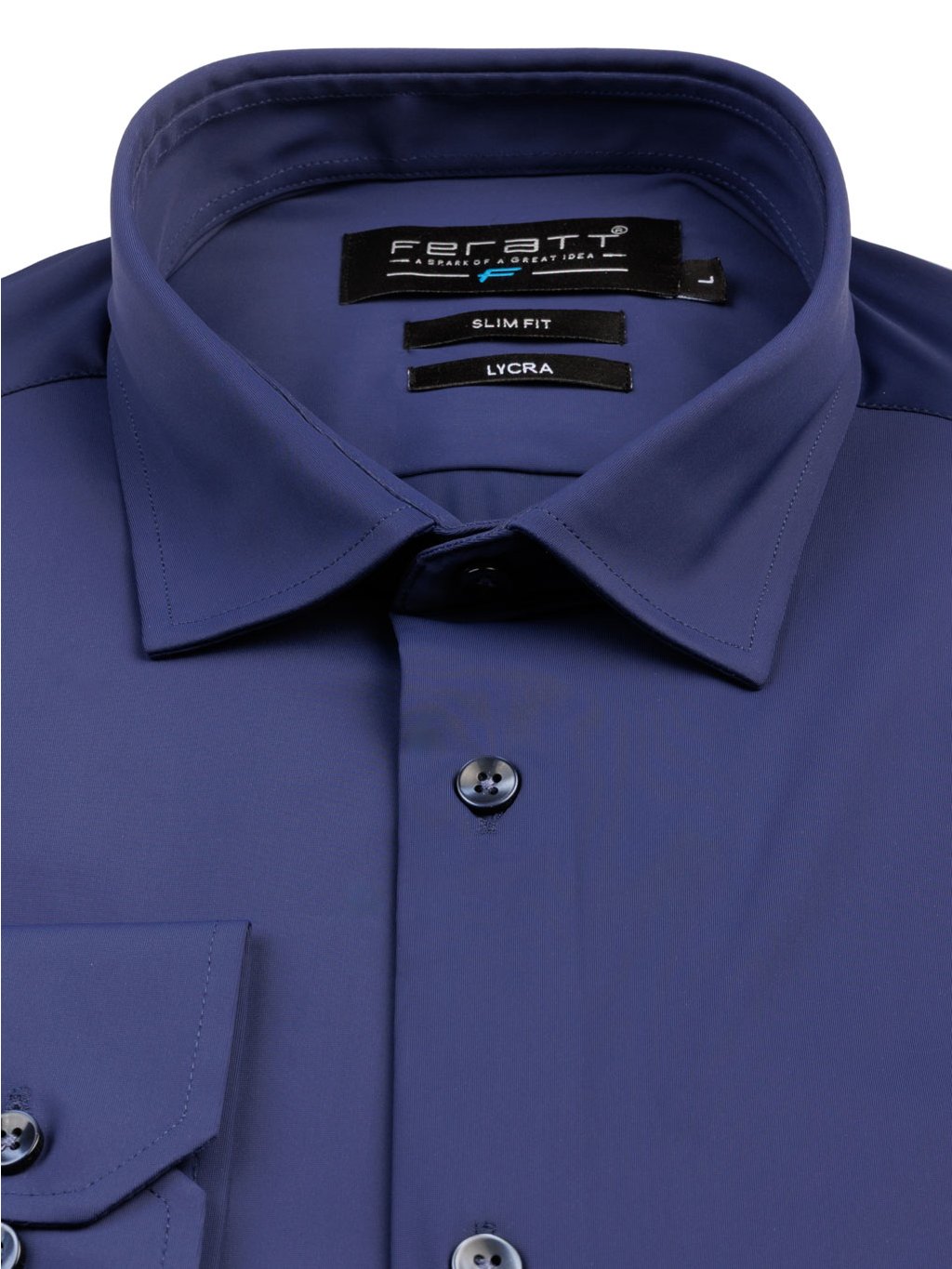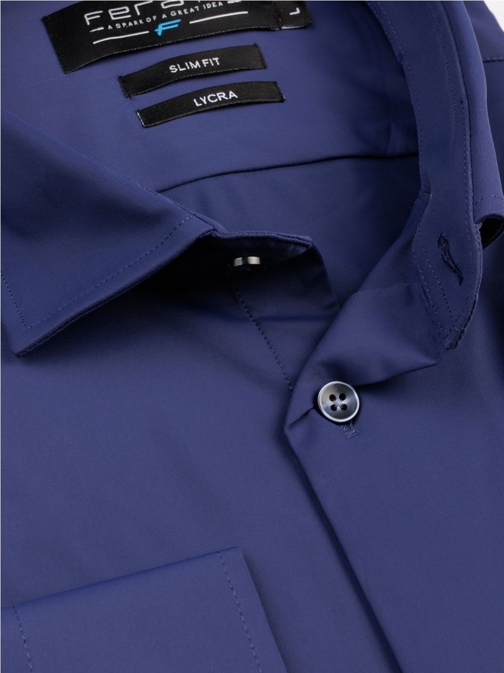 Pružná, prodyšná a nemačkavá pánská košile. Pohodlná funkční košile do práce, na cestování i pro volný čas v modré barvě. Střih slim fit.