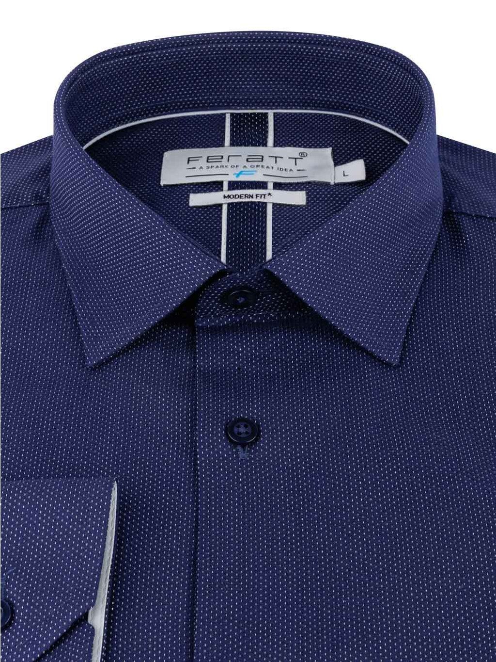 Pánská košile STUART v tmavě modré barvě s jemným bílým vzorem. Ušita ze 100% bavlny ve střihu modern fit.
