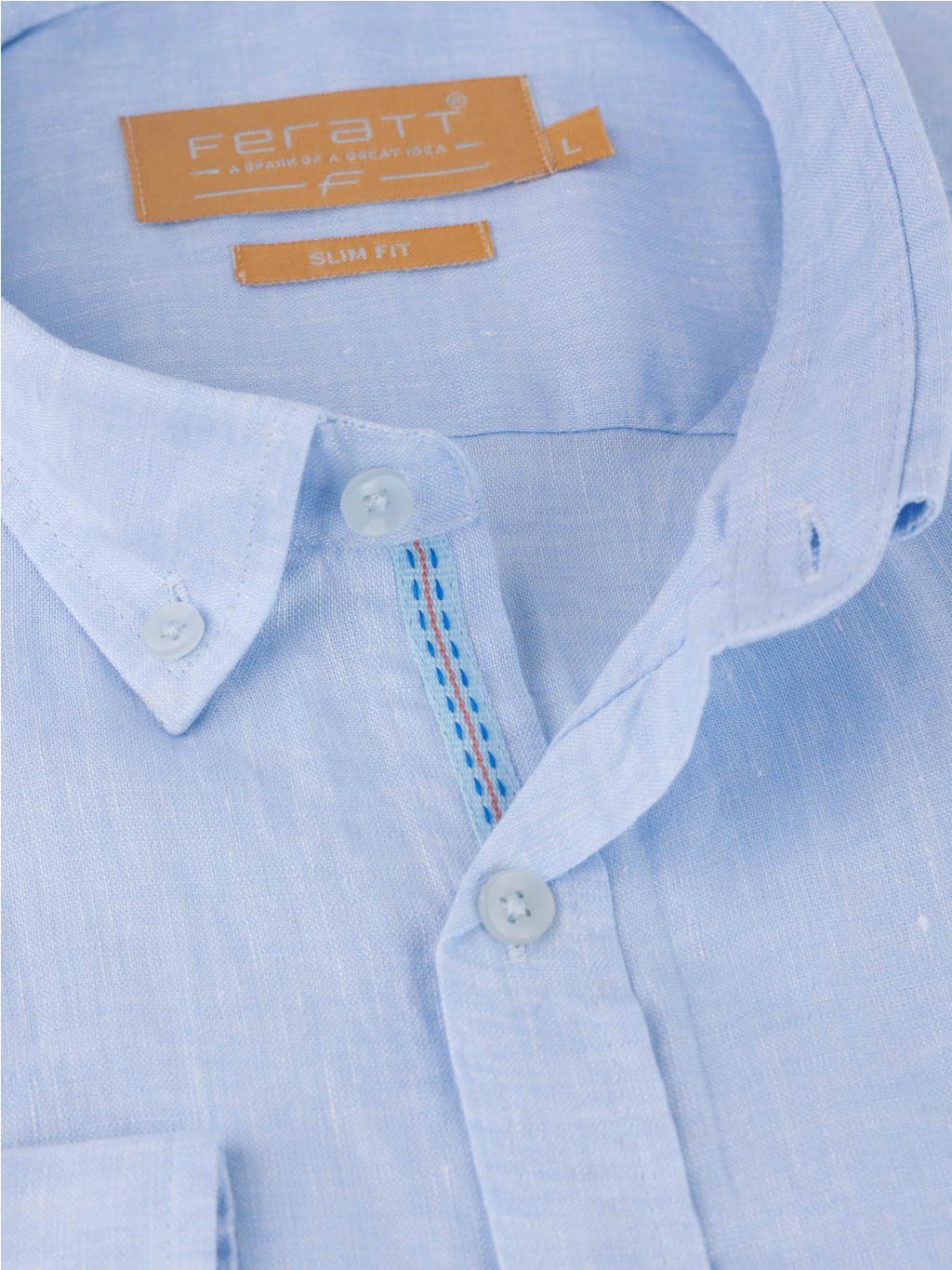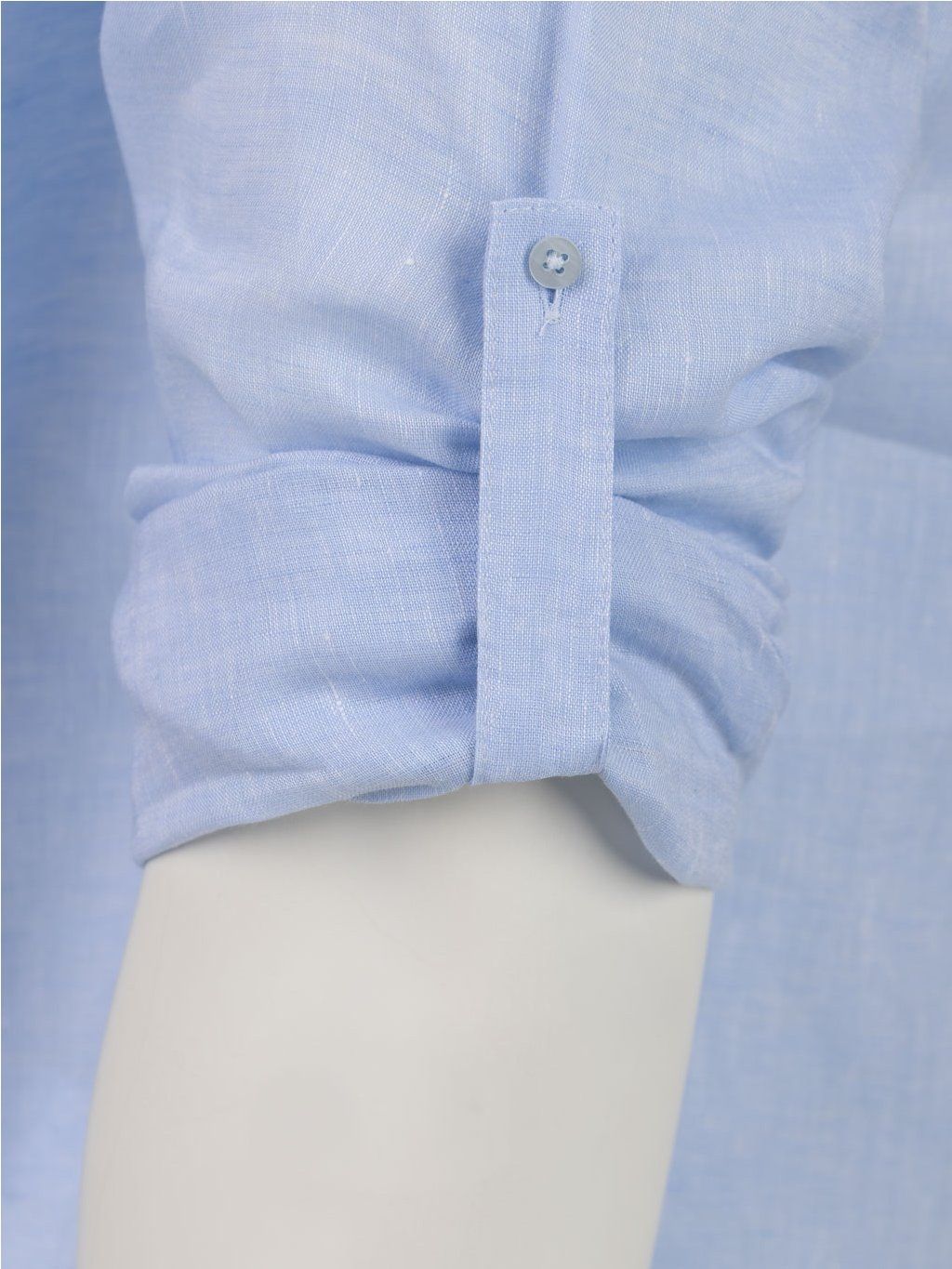 Lněný materiál je odolný, prodyšný a příjemný na dotek. Rychle schne, dobře absorbuje vlhkost a nepohlcuje nepříjemné pachy. Límeček je doplněný knoflíčkem, který mu pomáhá udržet tvar.