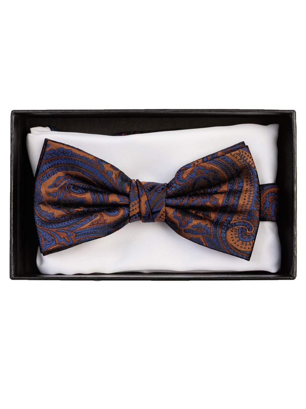 Pánský předvázaný motýlek FERATT v kombinaci královské modré a měděné barvy. Součástí setu je bílý kapesníček. Nastavitelná velikost kolem krku.
