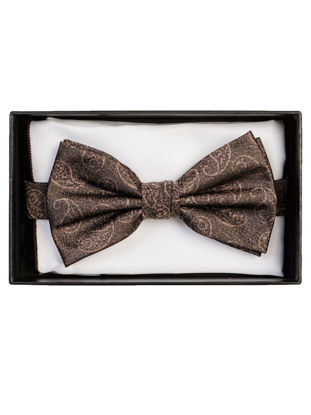 Pánský předvázaný motýlek FERATT v hnědé barvě s kontrastním kašmírovým vzorem. Součástí setu je bílý kapesníček. Nastavitelná velikost kolem krku.