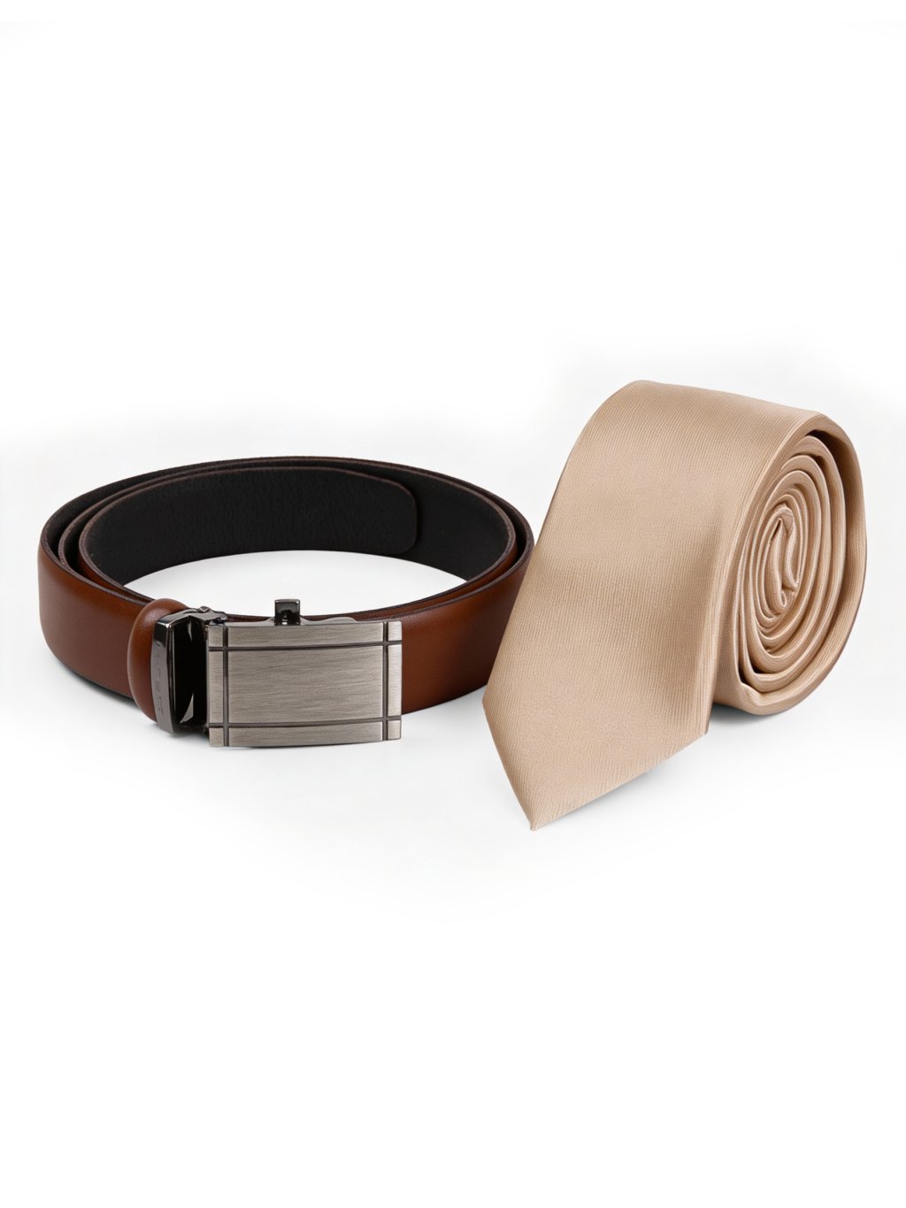 Pánský set zlaté kravaty a hnědého koženého opasku automat.