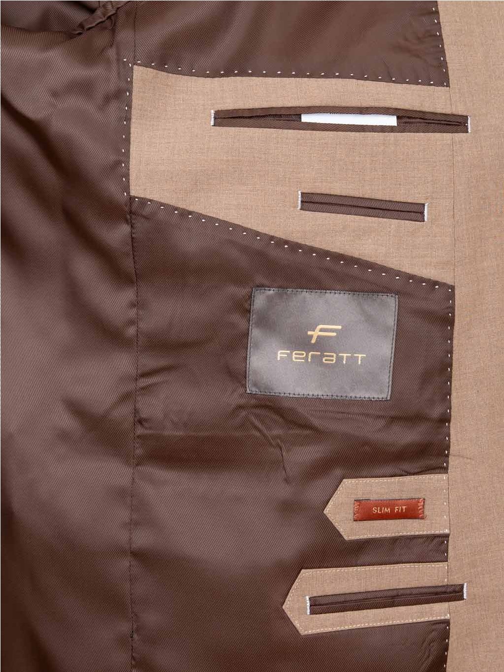 - Vnitřní strana saka je opatřena podšívkou hnědé barvy. Podšívka je ozdobně prošitá kontrastním prošitím ve světlé barvě, ve stylu ručního prošití.